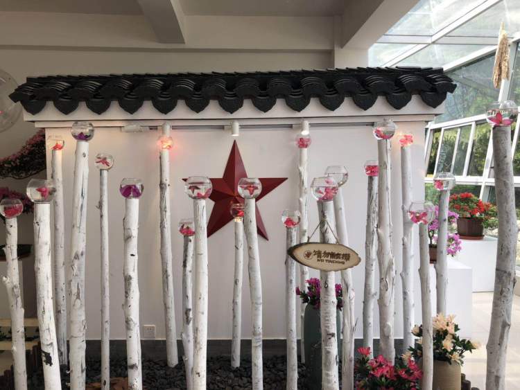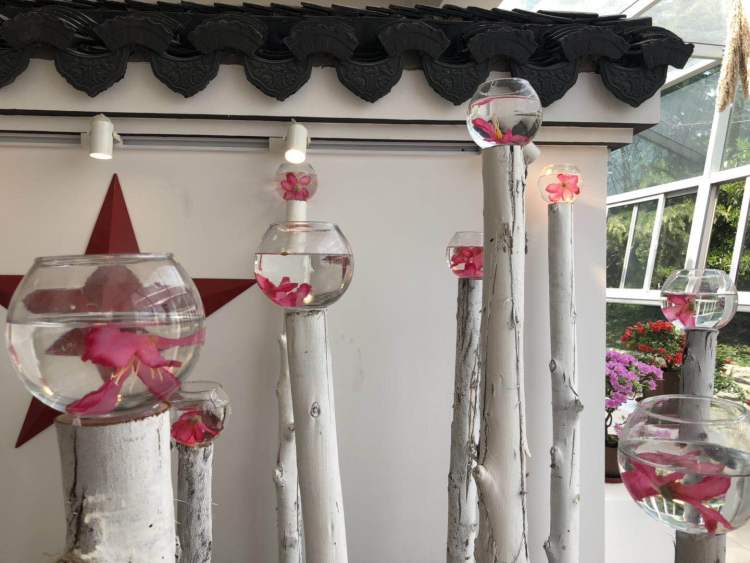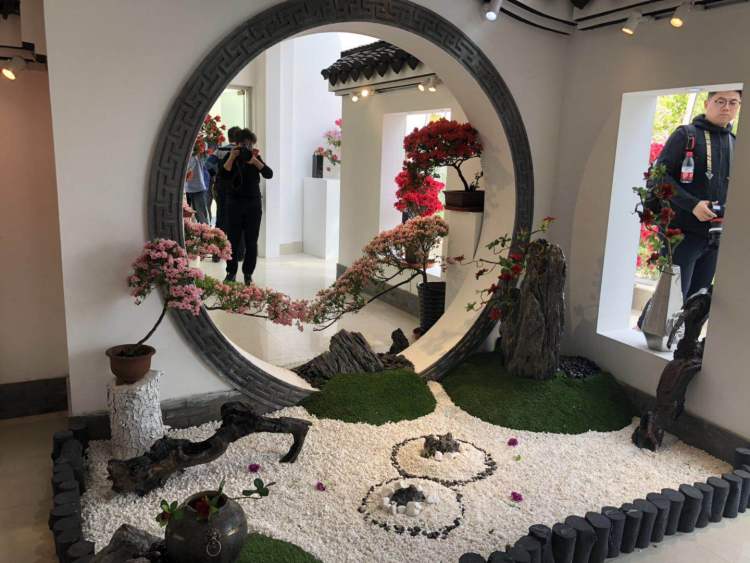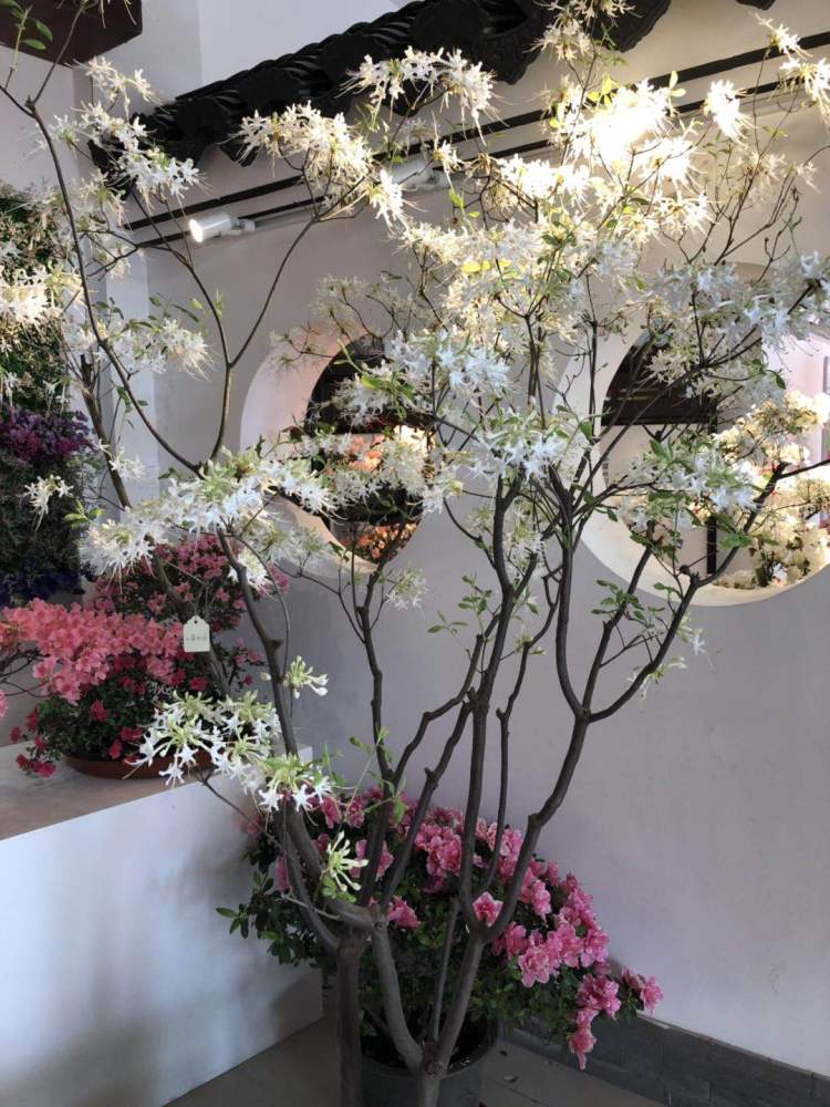 除了这处景点,目前已开花的杜鹃集中于揽胜轩的室内盆景展区。白墙灰瓦的江南建筑元素之中,一盆盆杜鹃点缀其中,再配以优雅的音乐,给人良好的观赏体验。细细品味一盆盆杜鹃,花色、花型、株型均不相同,其中有一盆“山麓杜鹃”非常特别,开白色的花,花型也与多数杜鹃不同,属十分稀有的品种。