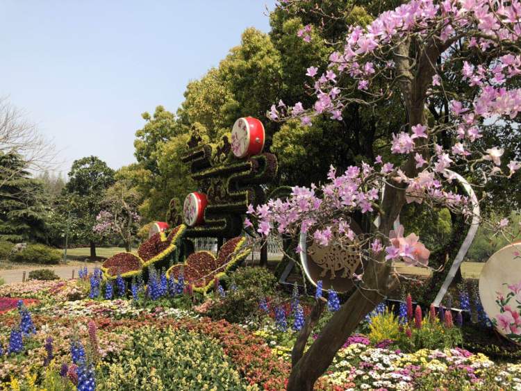 杜鹃各品种之中,映山红已经盛开。在公园主入口的大草坪醒目处,有一个景点名为“好时节”,其中两株高大的映山红很是显眼。据悉,这两株映山红乃园内最年长的映山红,树龄估计在150年左右。两株映山红被毛地黄等草花环绕,景点内还综合运用立体绿化、剪纸等艺术手法,展现了杜鹃在景点搭配中的魅力。