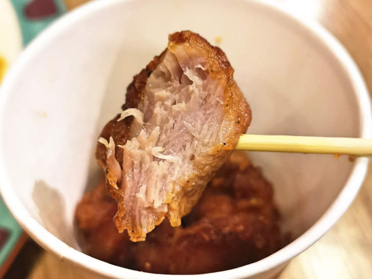 这家店的里脊肉和长发的一样,都是块状的猪里脊肉。比起马路边竹签串起、装在一次性白色泡沫盒里,这儿的里脊直接按块盛放在一次性纸杯里。一份10元,大概有七八块里脊。里脊肉表面炸得焦香四溢,肉质厚实,甚至能感受到猪肉的纤维,而且也不会塞牙缝,的确是不输长发。