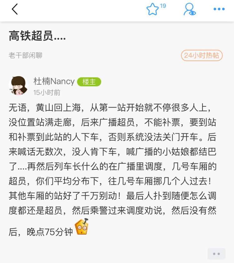 有乘坐G7192次列车从黄山回上海的网友表示,从第一站开始就不停有很多人上车,最终列车广播超员,晚点了一个多小时。