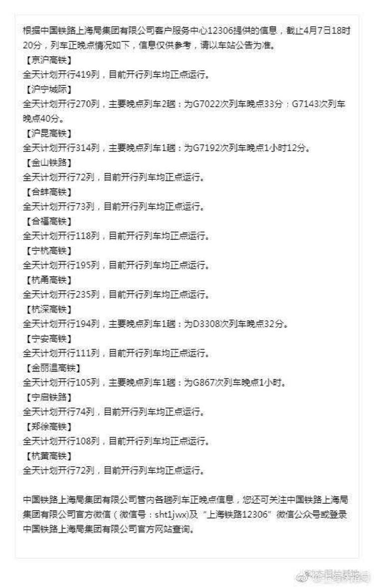 昨晚,中国铁路上海局发布了消息:截至4月7日18时20分,列车正晚点情况如下: