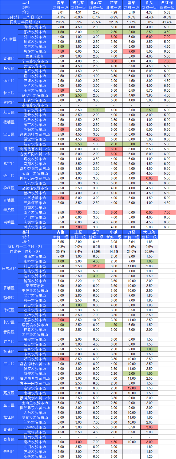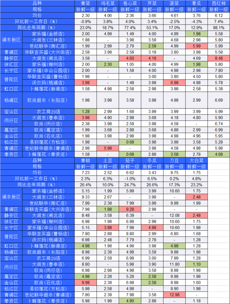 ■粉底标注代表该蔬菜品种在上述农贸市场或超市的最高价;绿底标注代表该蔬菜品种在上述农贸市场或超市的最低价