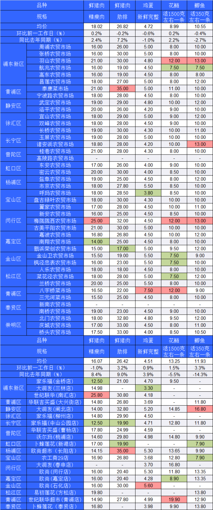 ■粉底标注代表该肉蛋鱼品种在上述农贸市场或超市的最高价;绿底标注代表该肉蛋鱼品种在上述农贸市场或超市的最低价