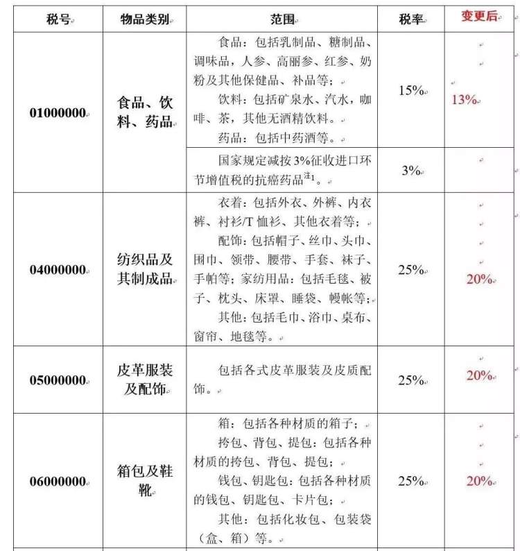 此次减税规定,从2019年4月9日起,对个人携带进境的食品、药品等商品,行邮税率由15%降至13%;纺织品、电器等由25%降为20%。