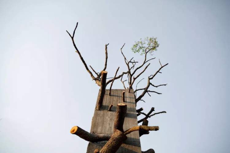 这是一棵被混凝土浇筑的香樟树,灰色的混凝土宛如粗大的树干,牢牢地支撑着妄图逃跑的树枝。通过表达禁锢与支撑的矛盾,艺术家旨在唤起观者对个体的感知和对社会结构的思考。