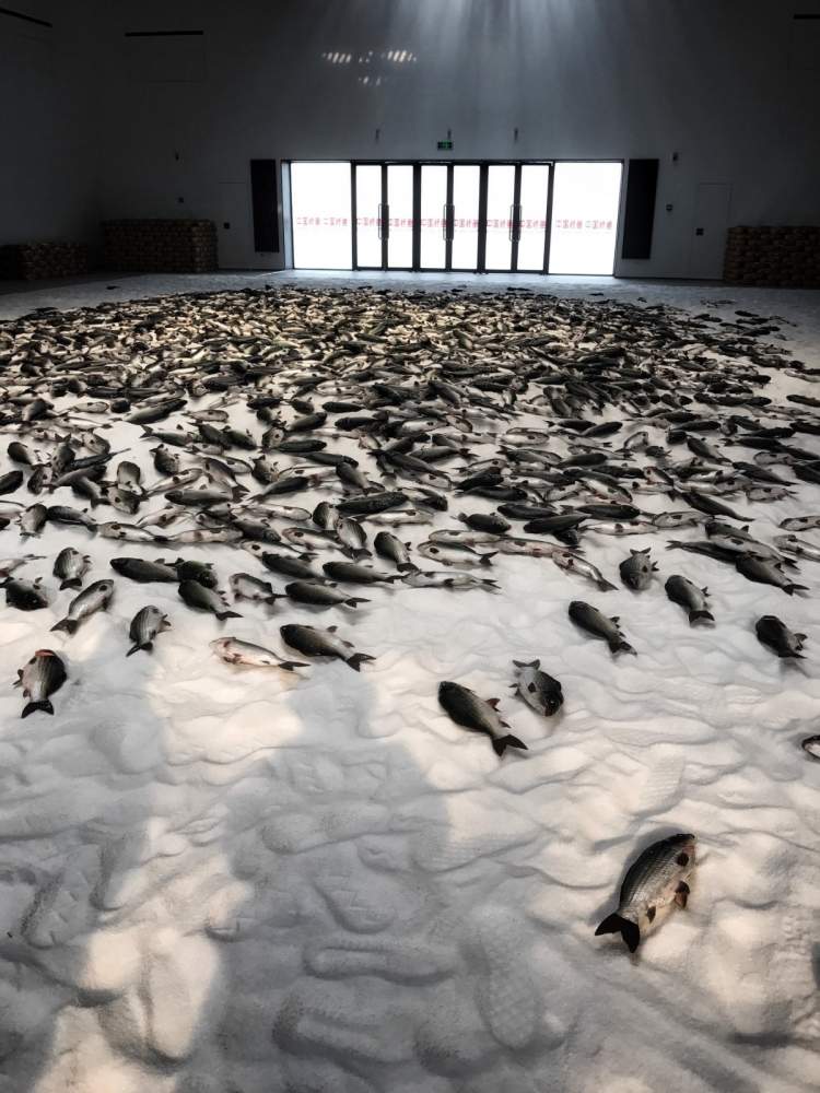 ■雅娜•文德伦《隔骨传音:与鲤鱼一起聆听》,四声道声音装置,28分钟循环播放,由水听器录音并现场合成乌镇当地鱼类和甲壳动物声音,2019年