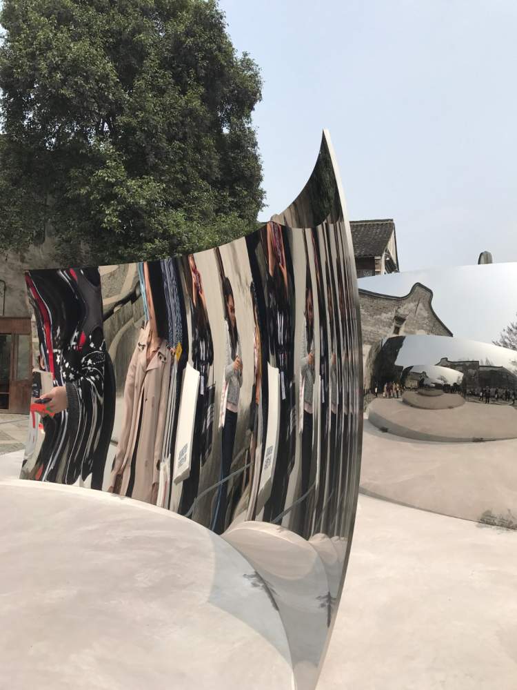 《双眩》如同两块后现代的电影荧幕,突如其来地插入古色古香的乌镇,为观众带来了强烈的视觉体验。人们在被不锈钢的凹面拉近,却找不到自己的身影。