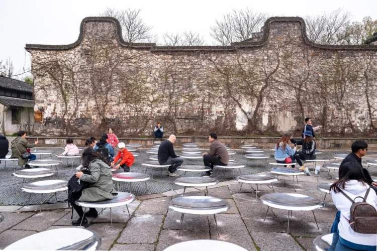 而在河边的乌镇铺石广场上,座椅镜面的材质犹如水面映照并融合进周遭风景,仿佛在广场中悄然而生的一处水面,当地居民与游客坐在座椅上,银光熠熠,如坐于水面,这是日本知名建筑师、普利兹克奖得主妹岛和世的作品《另一水面 》。