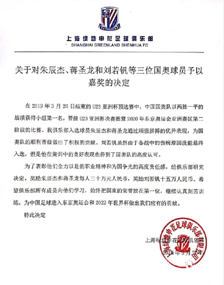 奥预赛完成出线任务后,蒋圣龙跟队友朱辰杰、刘若钒得到了申花俱乐部的嘉奖,其中蒋圣龙和朱辰杰被奖励人民币30万元。