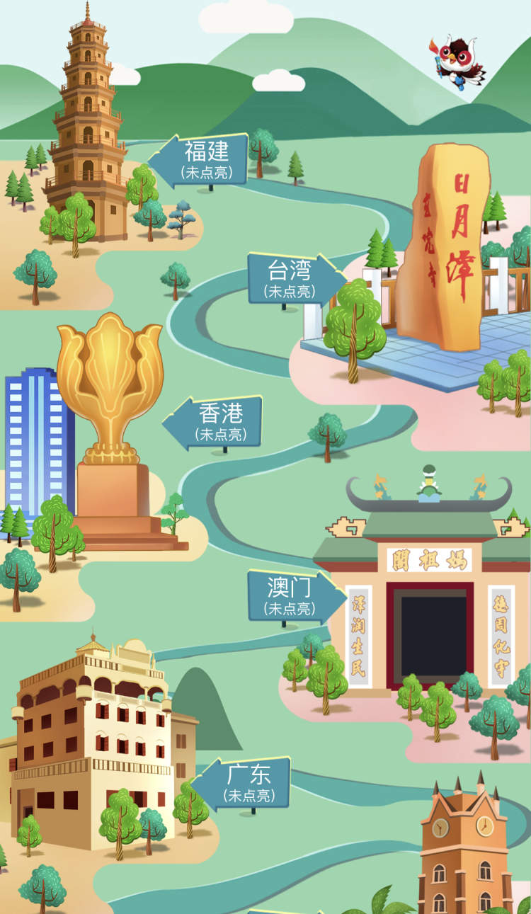 在设计方面,页面以孟菲斯风格为主,小程序功能模块采用游戏布局风格,将体育元素和山西元素融入至页面中,充分展示二青会的专属特色。吉祥物青青手持火炬在全国44个站点进行传递,精美手绘图选取当地特色景点。