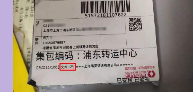 快递上写着“文件书刊”