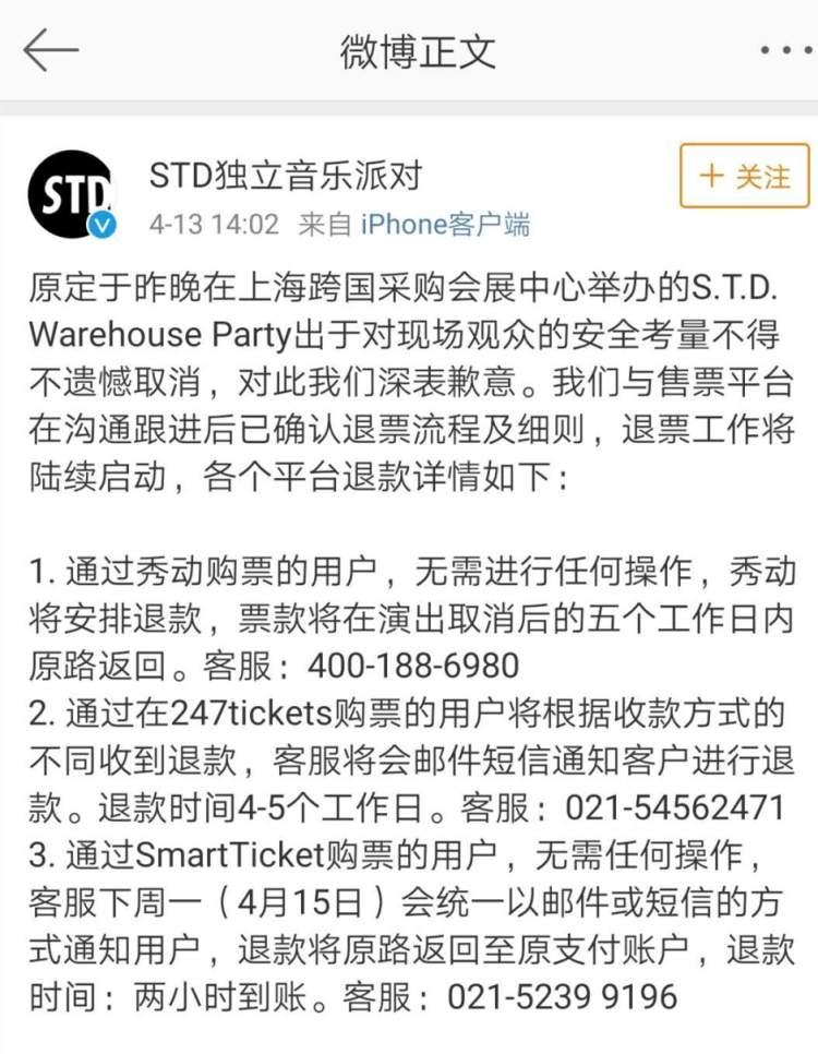对于演出的取消,演出主办方S.T.D. Warehouse Party也在微博上发出声明,表示出于对现场观众的安全考量不得不遗憾取消演出,退票工作正在陆续启动。