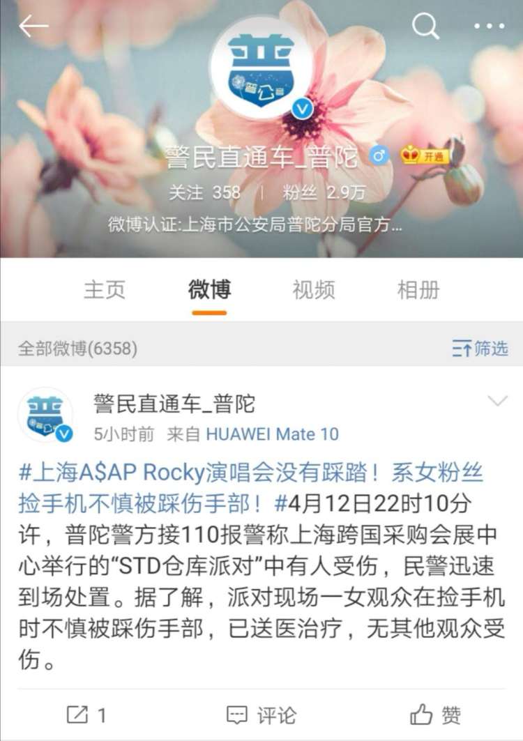 “上海A$AP Rocky演唱会没有踩踏,系女粉丝捡手机不慎被踩伤手部!”据上海普陀警方介绍,4月12日22时10分许,普陀警方接110报警称上海跨国采购会展中心举行的“STD仓库派对”中有人受伤,民警迅速到场处置。据了解,派对现场一女观众在捡手机时不慎被踩伤手部,已送医治疗,无其他观众受伤。