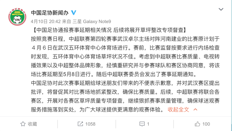 除此之外,中超武汉卓尔更是因为主场草皮质量不达标而造成与河南建业的比赛被迫延期。针对这一事件,足协三天前刚刚发布会公告称:“中超联赛将联合各赛区,开展对各赛区草坪质量专项督查,继续狠抓赛事质量管理,确保球迷观赛服务措施落到实处,为广大球迷提供更满意的观赛体验。”
