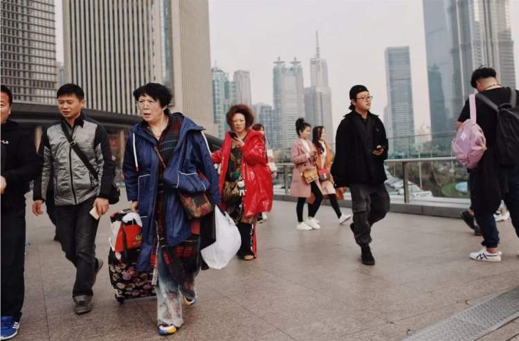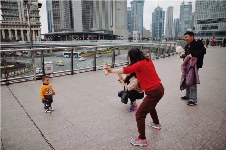 一位身穿格子风衣的阿姨成功引起了我们的注意。她站在天桥上,以东方明珠为背景,拍了很多张照片,脸上的笑容堆成了山。