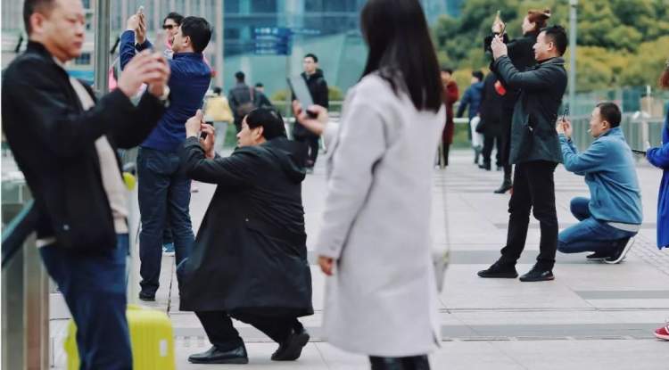专门到摄影点拍照的游客毕竟是少数,多数游客还是会掏出手机,用自拍或互拍的方式打卡“上海到此一游”。