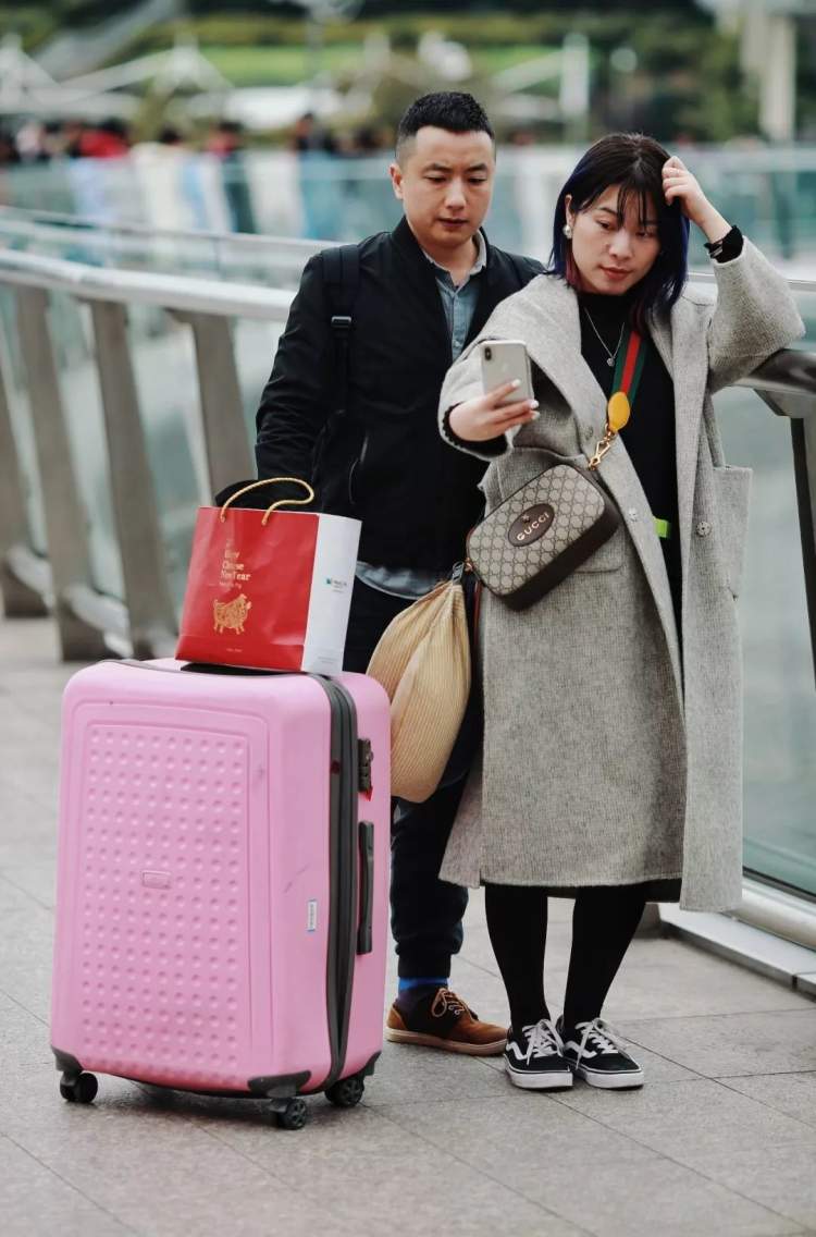 ■拖着拉杆箱赶路的游客,走着走着掏出手机自拍起来了。