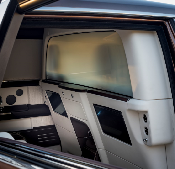 配备于长轴距全新幻影的“私密套间”,完美展现了集奢华体验与先进科技于一身的设计理念:一键启动电控隐私玻璃隔屏便可将前后座舱隔离开来。后排乘客既可选择透明模式一览前方路况,也可选择不透光模式遮蔽前排,让客户尽享绝对私密而奢华感。“私密套间”内配置的内部对讲系统让隔屏内外的驾乘者可以随时沟通。