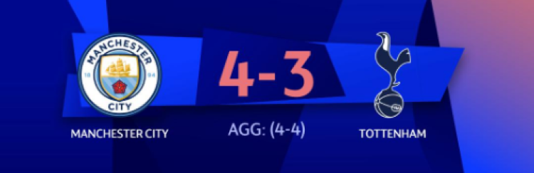 最终曼城4比3战胜热刺,总分4比4平,热刺凭借客场进球多的优势惊险晋级欧冠四强。
