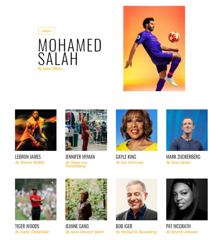 “全球最具影响力人物”榜从2004年开始评选,每年会按照“领导人与革命家”、“创业者与企业家”、“科学家与思想家”、“英雄与偶像”以及“艺术家与娱乐界人士”五大项目,选出当年全球在各行各业引领风潮的百位最具影响力人物。