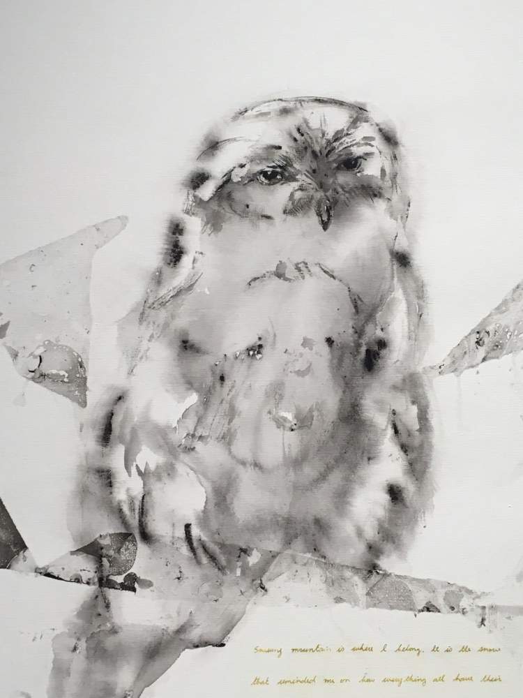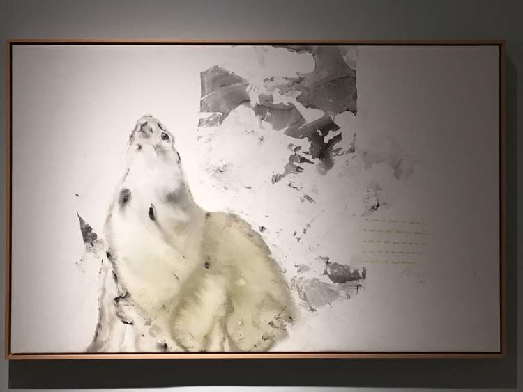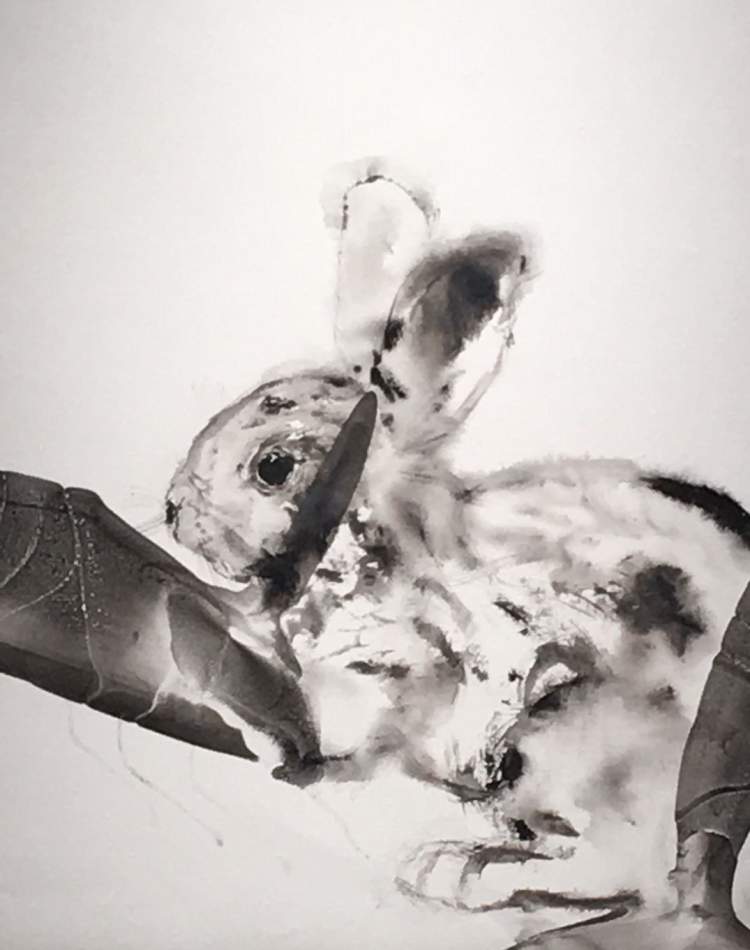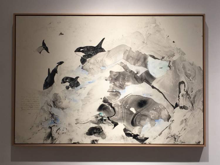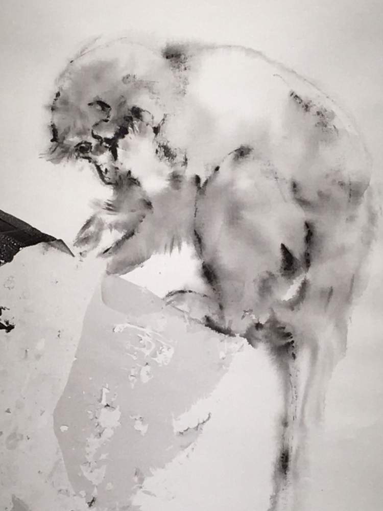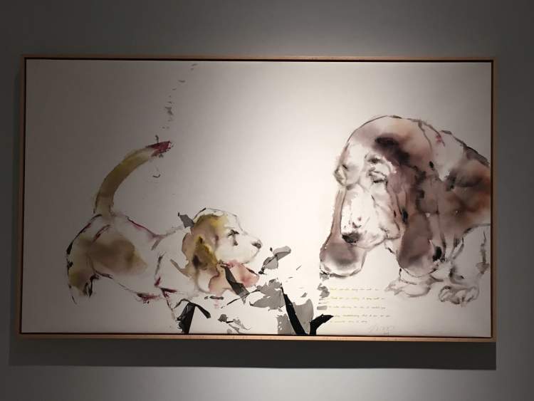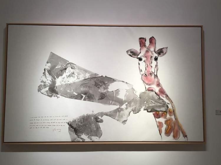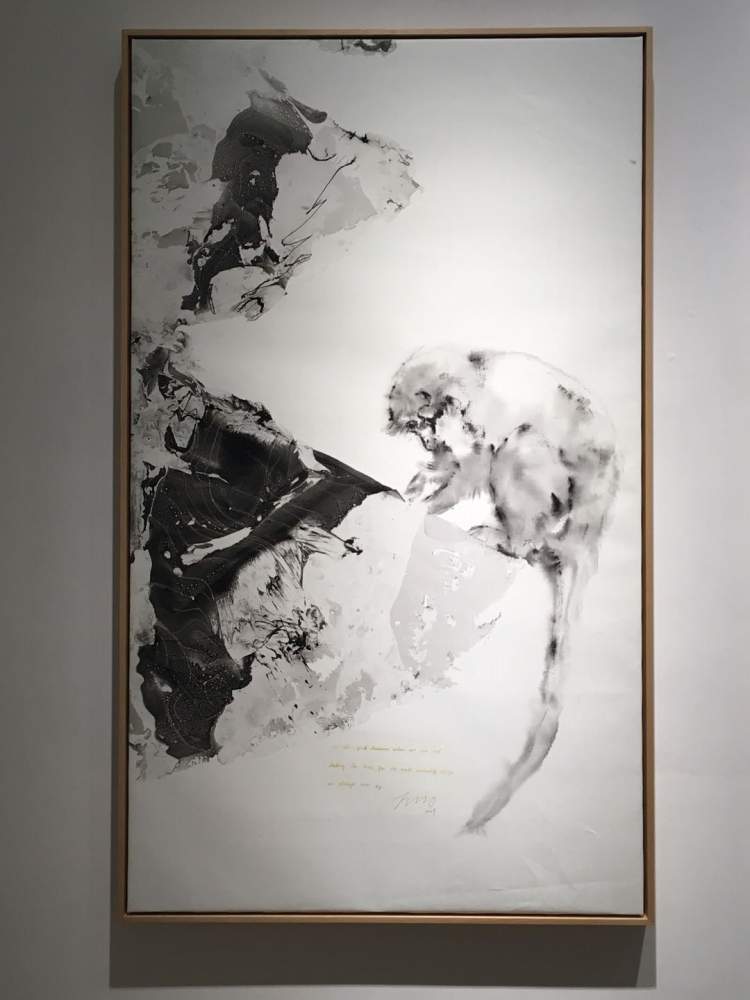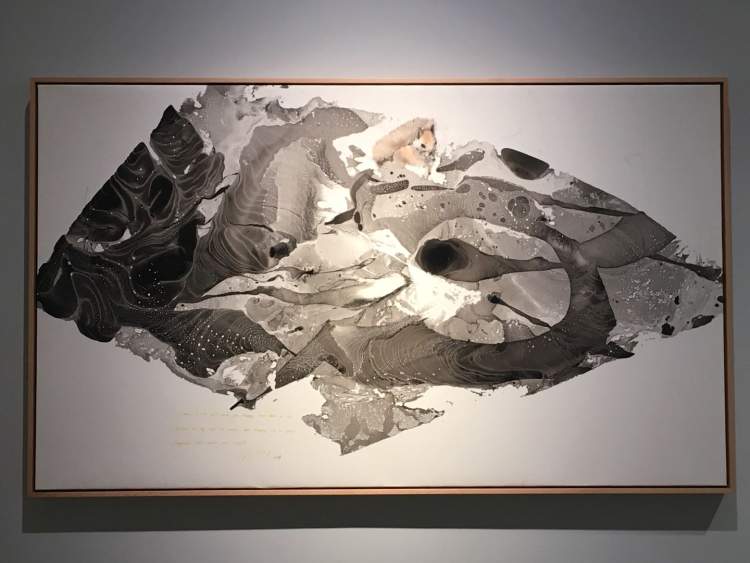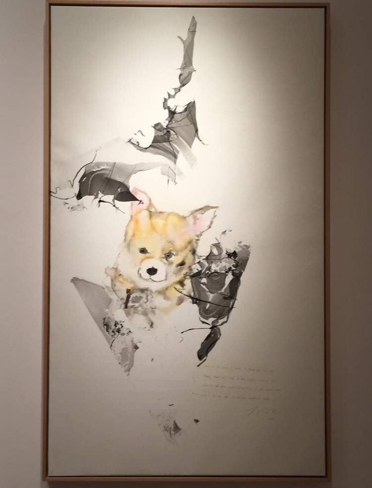 的确有点萌,关键是他在油画布上怎么能画出水墨效果呢?这些动物因为笔墨的晕化,而显得毛茸茸的,生动可爱。但这是油画,材料是油彩呀!