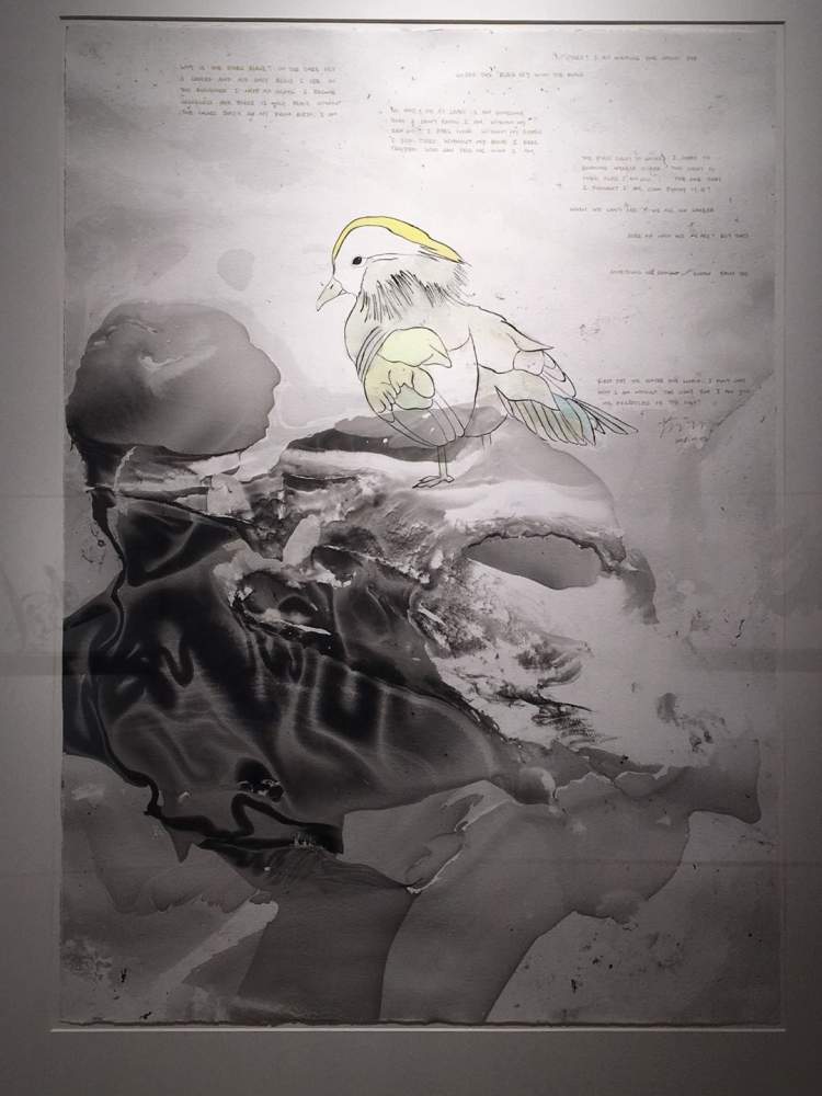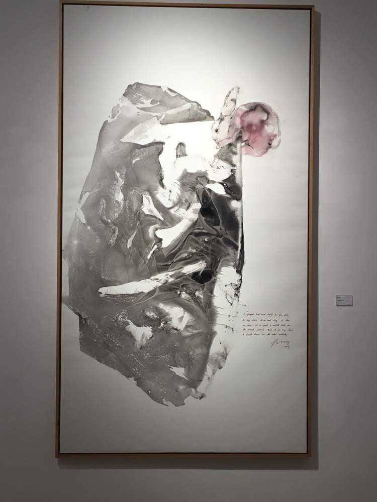 据透露,蒋友柏的创作中,使用了油漆、墨、水和水彩等多元材料,他的图式里,除了动物形象,更有大量的抽象语言、肌理效果、拼贴效果,再加上每幅画面上几乎都有蒋友柏写的英文文字,阐述当时的心情和体会,因此,他的作品很难归类于西画还是国画,也很难归类到某一种风格或画派。