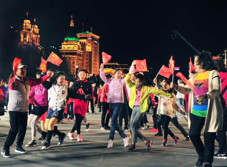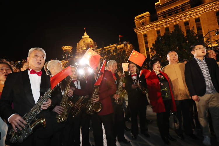 外滩成了一片红色的欢乐海洋:轮滑少年手执国旗在人群前滑过,江边和浦江游轮上的人们兴奋地互相舞动着国旗,钟楼在灯光投射下“身披”一面巨型国旗……越来越多的游人围聚过来跟着一起高歌,人们拿出手机记录这一特别的时刻。歌曲结束时,欢呼声响彻外滩。“我爱中国,我爱上海”,孩子们雀跃高呼。