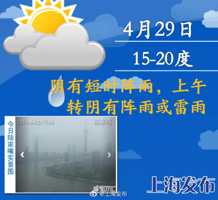 今天午后有中到大雨 15-20度 周到君 2019-4-29 来源:周到上海 今天上午以前沿江沿海地区有雾,上午转阴有阵雨或雷雨,雨量可达中到大雨,明天阴有时有小雨。东到东南风2-3级,今天下午转偏北风3-4级。今天最高温度20度,明天最低温度15度。出行的筒子们务必带好雨伞哦!五一小长假期间,本市以多云天气为主,气温在16-24度之间,较为温暖舒适。 来源:周到上海 作者:周到君 赞一个 (6)