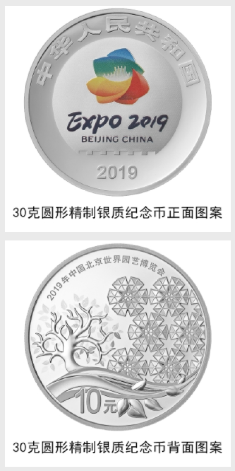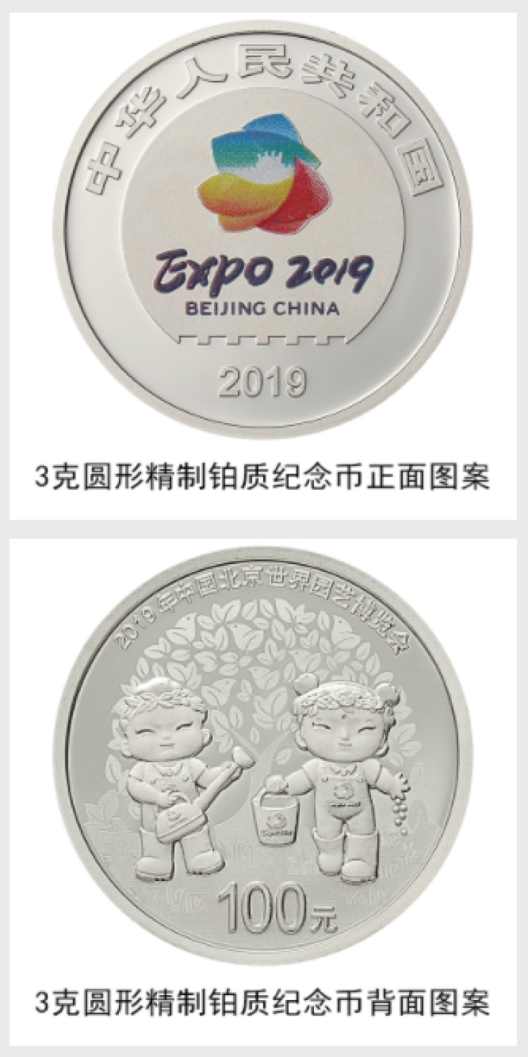 中国人民银行定于2019年4月29日发行2019年中国北京世界园艺博览会贵金属纪念币一套。该套贵金属纪念币共3枚,其中金质纪念币1枚,银质纪念币1枚,铂质纪念币1枚,均为中华人民共和国法定货币。