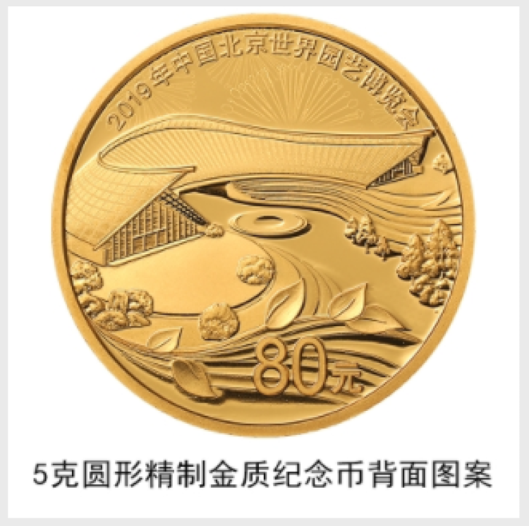 5克圆形金质纪念币背面图案为中国馆建筑造型及植物装饰图案等组合设计,并刊“2019年中国北京世界园艺博览会”中文字样及面额。