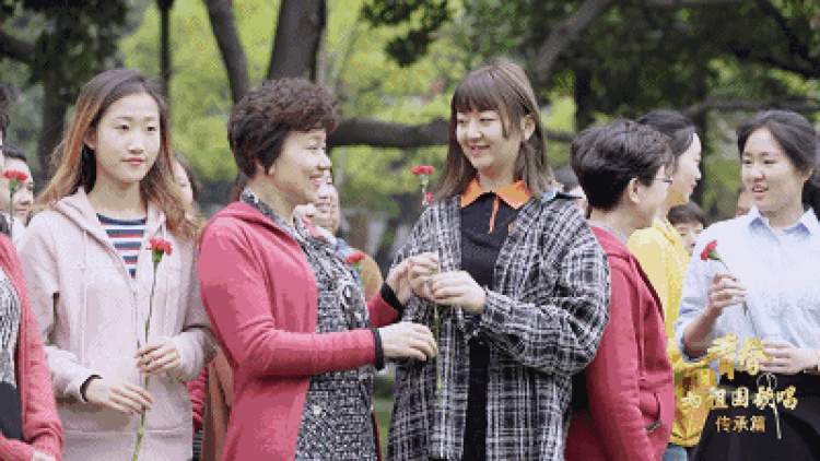 除了拍摄学校各爱国奋斗、服务奉献的群体代表歌唱之外,还特别设计了带有感恩和传承意味的画面,就是青年学生向前辈老师献花,前辈老师赠送一件物品给后辈。
