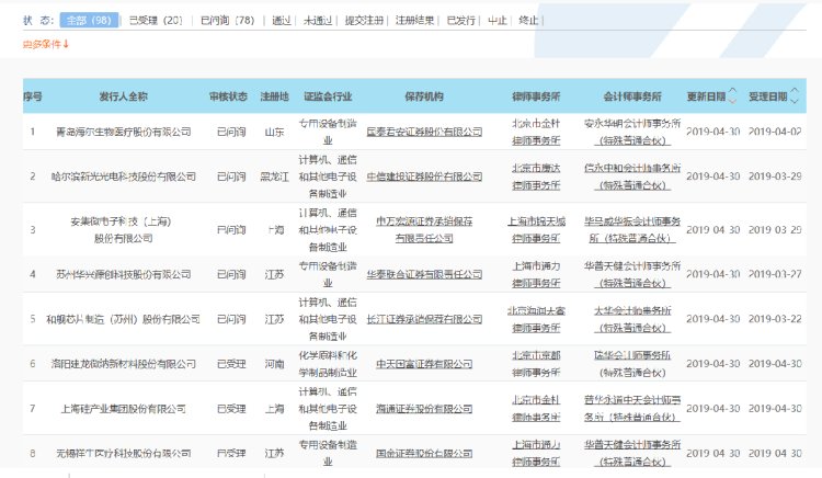 截至4月30日,科创板受理企业98家,78家公司进入问询阶段。当天,上海硅产业集团股份有限公司、无锡祥生医疗科技股份有限公司、洛阳建龙微纳新材料股份有限公司科创板上市申请获得受理。