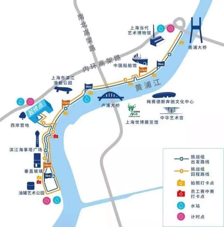 挑战组赛事路线起点也位于西岸营地,沿徐汇滨江内部道路向南 — 经海事塔 — 油罐艺术公园折返至油罐艺术公园前人行道 — 沿龙腾大道人行道向北进入徐汇滨江步道 — 沿徐汇滨江向北,经日晖港桥向北 — 沿黄浦滨江至南浦大桥处折返 — 沿黄浦滨江向南 — 至油罐艺术公园折返 — 沿龙腾大道人行道向北进入徐汇滨江步道向北进入徐汇滨江步道 — 沿徐汇滨江向北,直至返回终点西岸营地。