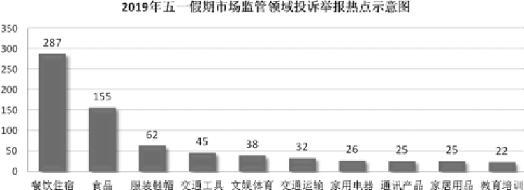 2019年五一小长假,上海市市场监管局共接到投诉举报1406件(投诉757件、举报219件),同比增长11%,解答咨询634件。餐饮住宿(287件)、食品(155件)、服装鞋帽(62件)、交通工具(45件)、文娱体育(38件)等诉求量居前。
