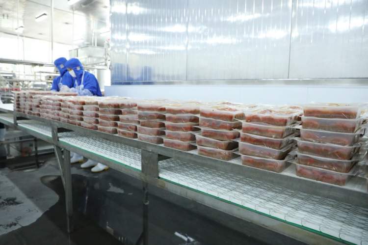 接下来,是对卫生要求更为严格的熟食加工区间。参观一行从头到脚都进行了严格的消毒才被允许进入。