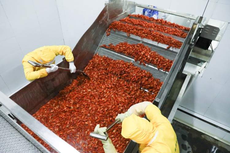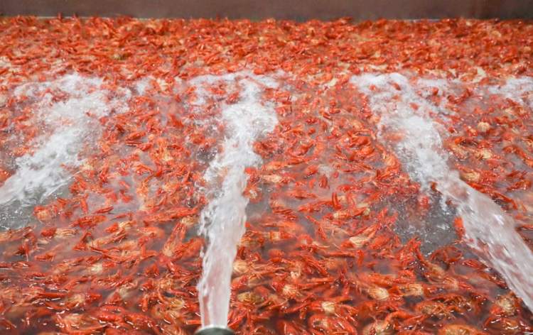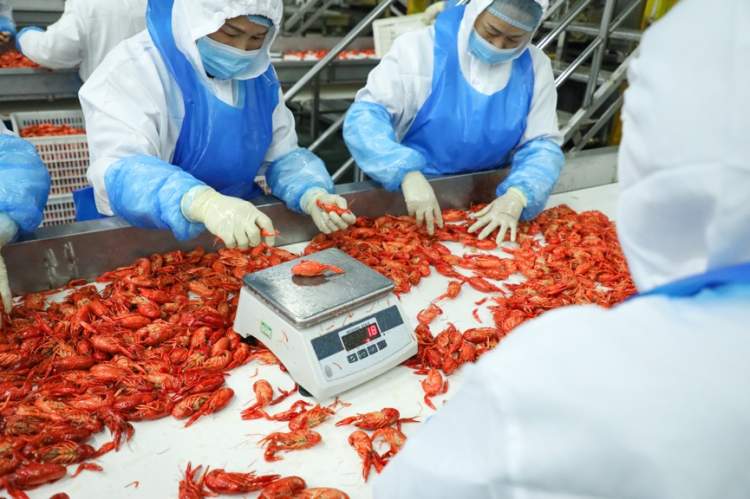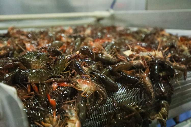 在小龙虾加工工厂的外面,周到君看到了尤为壮观的一幕,从养殖基地被打捞起的小龙虾一小时内就被送到这里,然后通过传送带送进工厂。