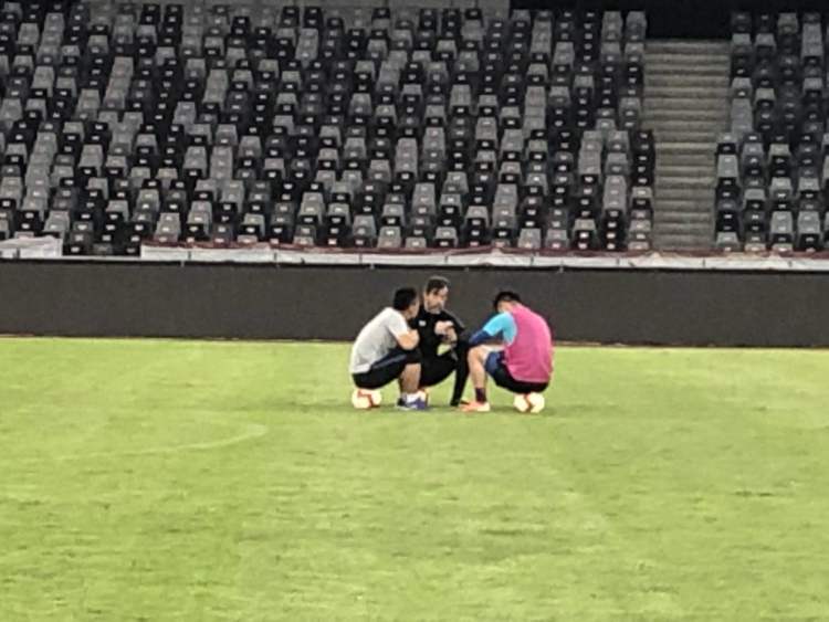 值得注意的是,在今天分组对抗结束前,弗洛雷斯将曹赟定叫了过来,弗洛雷斯、曹赟定以及翻译王侃3个人一人拿了一个足球,把足球当成小板凳,坐在足球上促膝长谈。其他队员放松训练结束了,弗洛雷斯与曹赟定的谈话仍没有结束,整个谈话进行了大约半个小时。