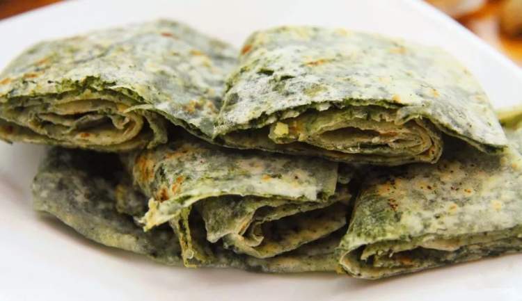 去宁海还可以尝尝当地的麦饼。各种馅料被做进饼里,压成扁扁的形状,烤得非常脆。一张张圆圆的大饼被切成六份,有苔菜和虾皮两种口味,一甜一咸,让人回味无穷。