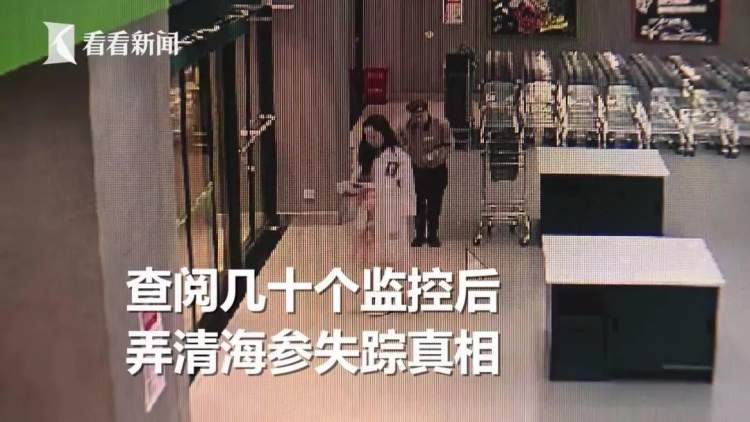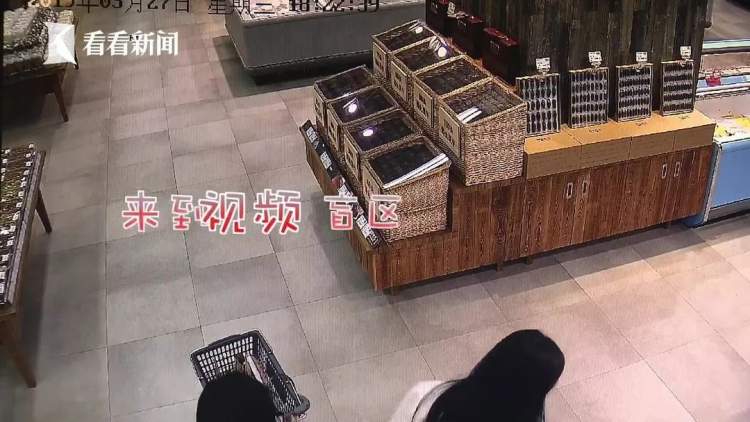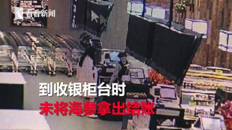 原来白衣女子先在超市内购买芥末、酱油等商品,在柜台称得海参后,故意来到超市一视频盲区将东西转移给了黑衣女子,自己结账离开。