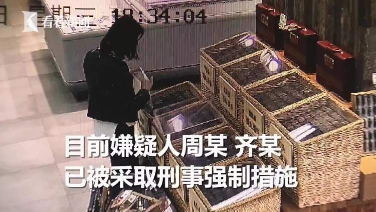 而在收银柜台时,白衣女子却未将海参拿出一并结账。原来,白衣女子结账后并未直接离开,而是在在超市出口处,等待另一名身穿黑色外衣,手提米色手提包的女子后一起离开。