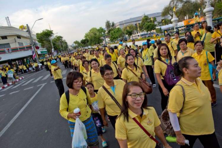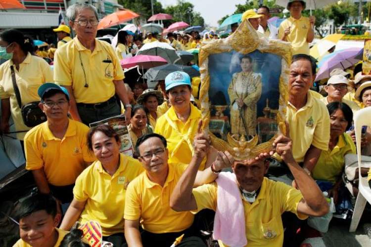 泰国民众穿上象征对王室忠诚的黄色衣服,以此表达对国王的祝福。