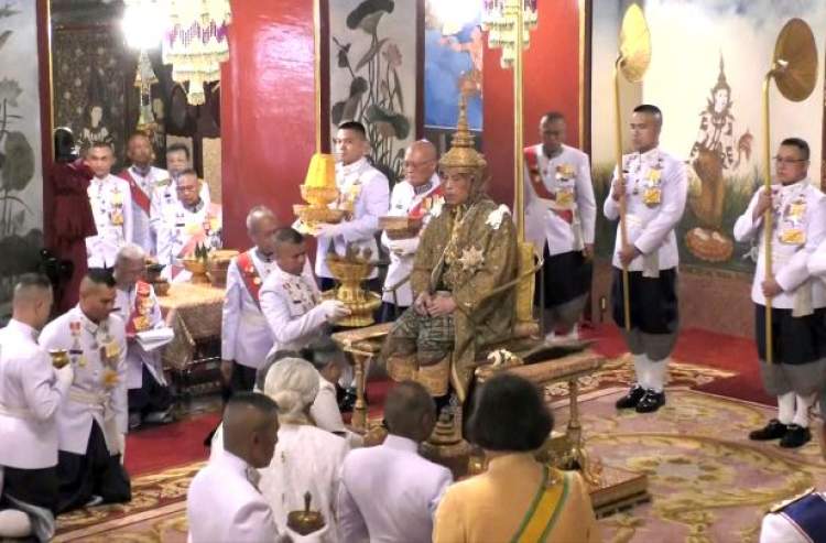 4日在曼谷大王宫举行的加冕仪式上,哇集拉隆功国王登上王座,佩戴上王冠,接受了王剑、权杖、王扇等圣器。