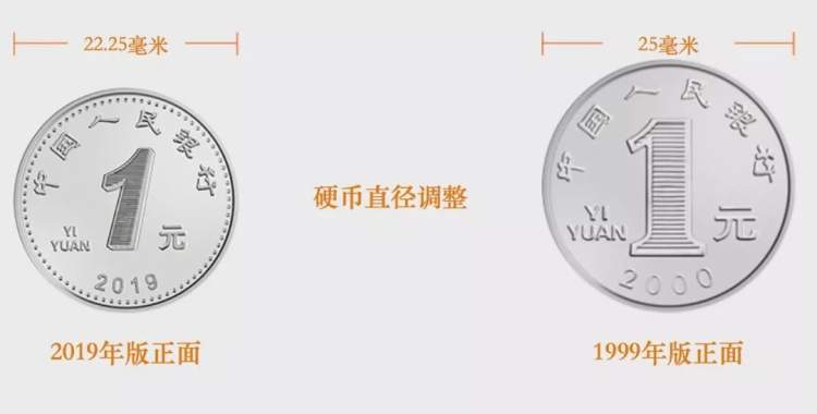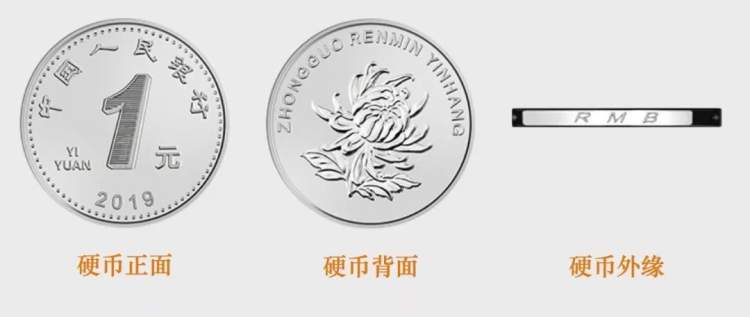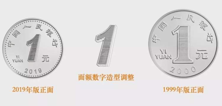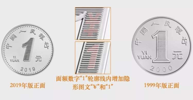 2019年版第五套人民币1元硬币保持1999年版第五套人民币1元硬币外形、外缘特征、“中国人民银行”行名、汉语拼音面额、人民币单位、花卉图案、汉语拼音行名等要素不变,调整了正面面额数字的造型,背面花卉图案适当收缩。直径由25毫米调整为22.25毫米。正面面额数字“1”轮廓线内增加隐形图文“¥”和“1”,边部增加圆点。材质保持不变。