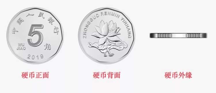 2019年版第五套人民币5角硬币保持1999年版第五套人民币5角硬币外形、外缘特征、“中国人民银行”行名、汉语拼音面额、人民币单位、花卉图案、汉语拼音行名等要素不变,调整了正面面额数字的造型,背面花卉图案适当收缩。材质由钢芯镀铜合金改为钢芯镀镍,色泽由金黄色改为镍白色。正背面内周缘由圆形调整为多边形。直径保持不变。