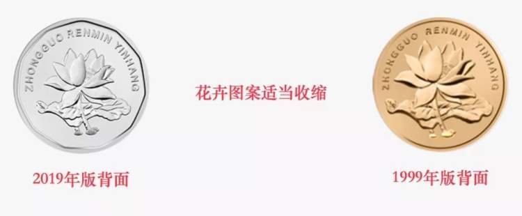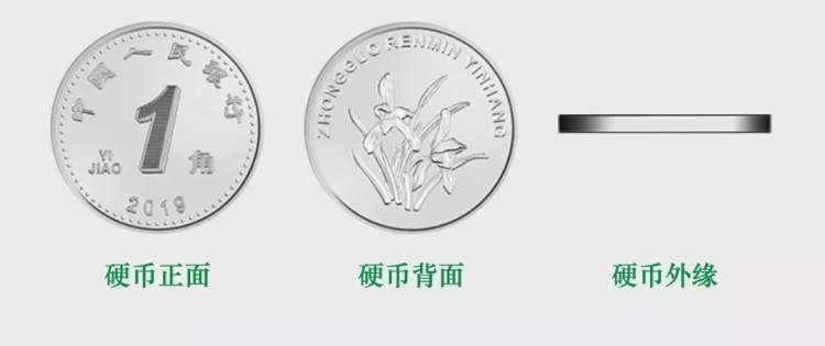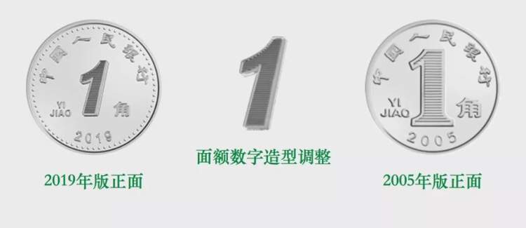 2019年版第五套人民币1角硬币保持2005年版第五套人民币1角硬币外形、外缘特征、“中国人民银行”行名、汉语拼音面额、人民币单位、花卉图案、汉语拼音行名等要素不变,调整了正面面额数字的造型,背面花卉图案适当收缩。正面边部增加圆点。直径和材质保持不变。