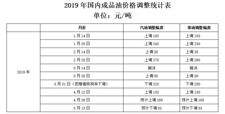 目前2019年国内成品油调价共进行了九次,具体为上调七次、下调一次,搁浅一次,汽油总计上调了875元/吨,柴油总计上调了860元/吨。(含3月31日因增值税税率调整而进行的下调)