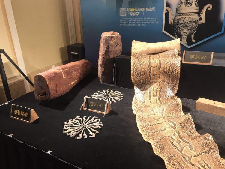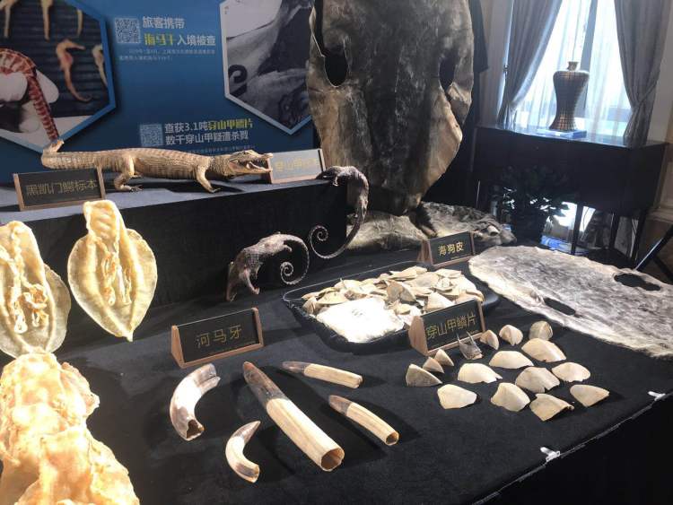 记者在今天上午举行的打击象牙等濒危物种及其制品走私新闻发布会上了解到,前4个月,上海海关共缴获象牙制品10.26千克,穿山甲鳞片316.6千克,刺猬紫檀438吨,檀香紫檀80吨,以及加利福尼亚湾石首鱼鱼鳔、海马干、河马牙、穿山甲、玳瑁、海狗皮等近千件。