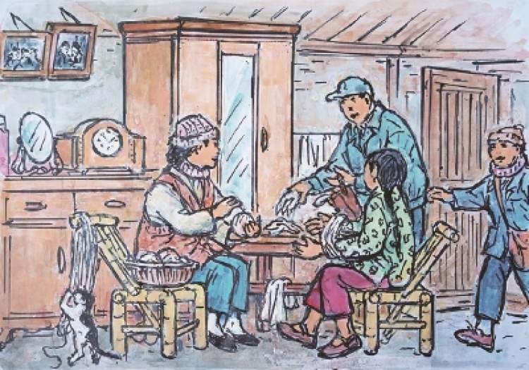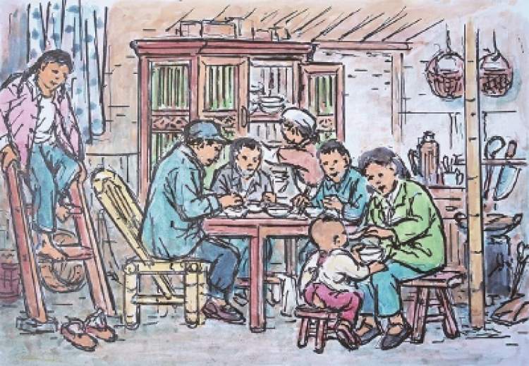 那时家妇很勤劳,起早摸黑买汰烧;一家衣衫自缝补,领儿家务她全包。