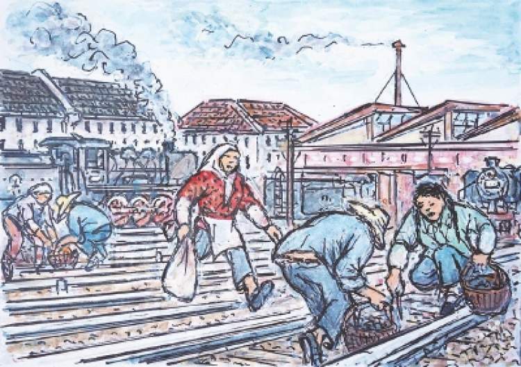 铁路蒸汽火车头,烧落煤碴积路基;就近居民捡煤碴,不顾自身命危险。