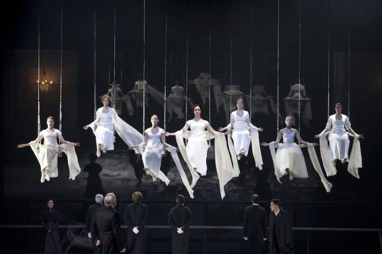 与文本的诗意呈现相辅相成的是导演所构建的独特舞台美学——灰冷的一抹高墙,镶嵌于整个舞台后方的巨大镜面,飞旋向上的数十只秋千,徐徐飘扬的漫天大雪,少女们的金色发辫和悲剧降临时肃穆的幽暗色调,在舞台上层叠构建出一种独特而庄严的悲怆美学。